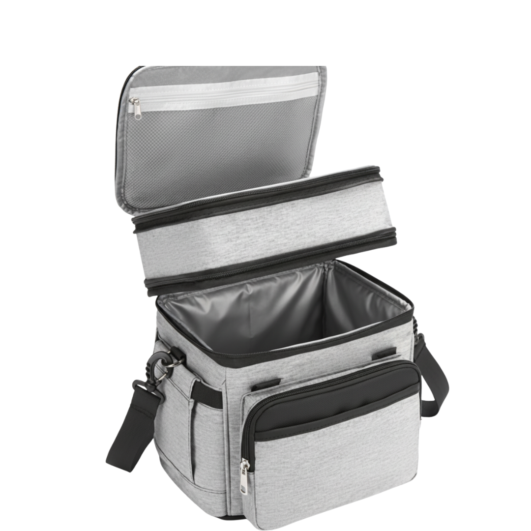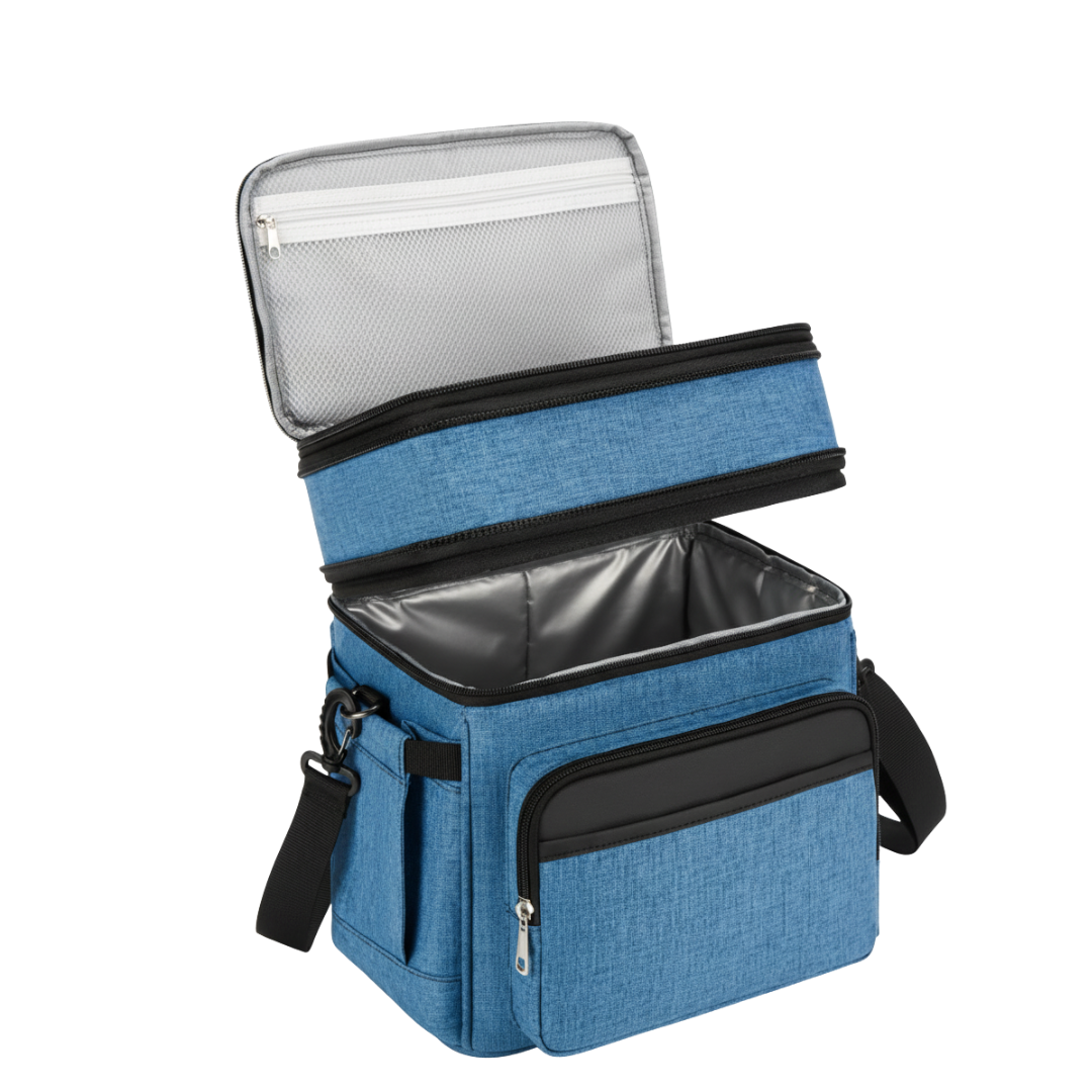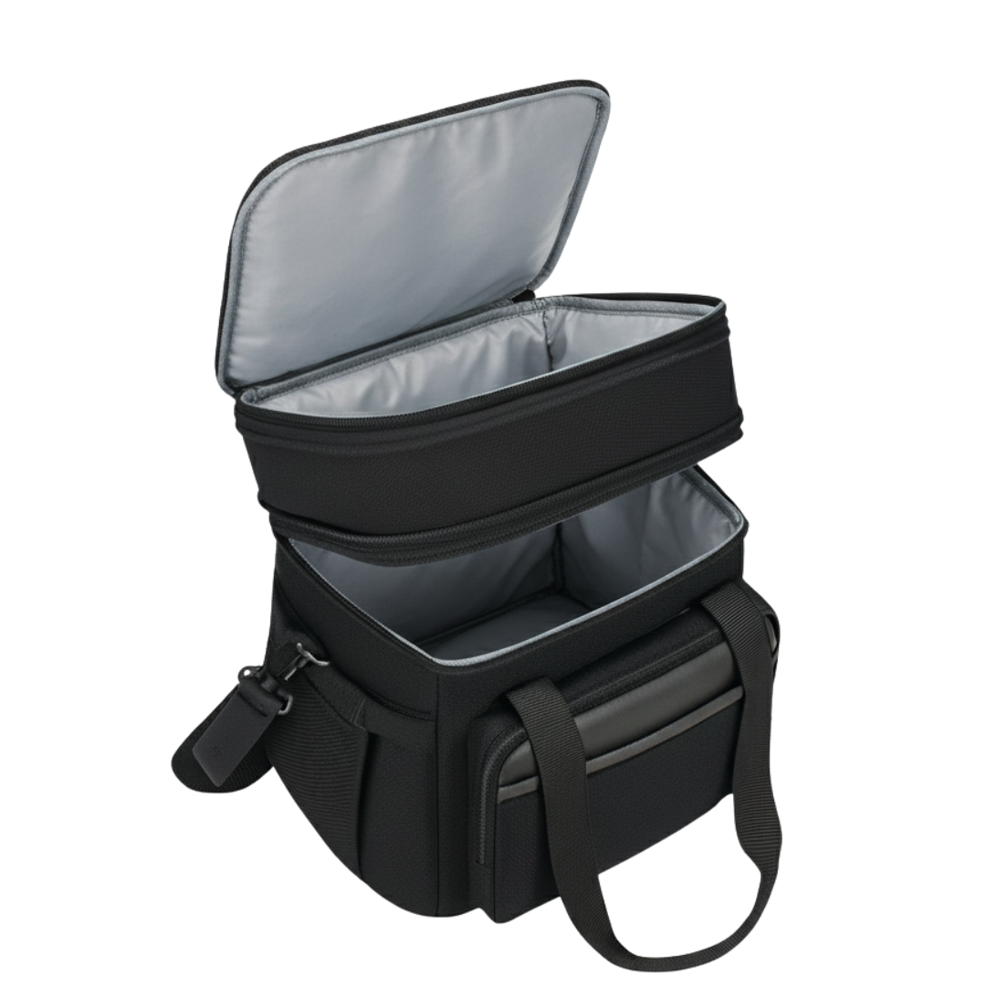 The dual-compartment design separates dry and wet foods, keeping textures intact during transport. The upper area fits snacks or fruit, while the lower compartment accommodates larger boxes or beverages. A six-millimeter insulated liner helps maintain temperature for 8 to 18 hours depending on the surroundings. Each compartment is sealed through heat-pressing to minimize leakage and preserve structure. Side and front pockets provide quick access to utensils, napkins, or small items during travel.