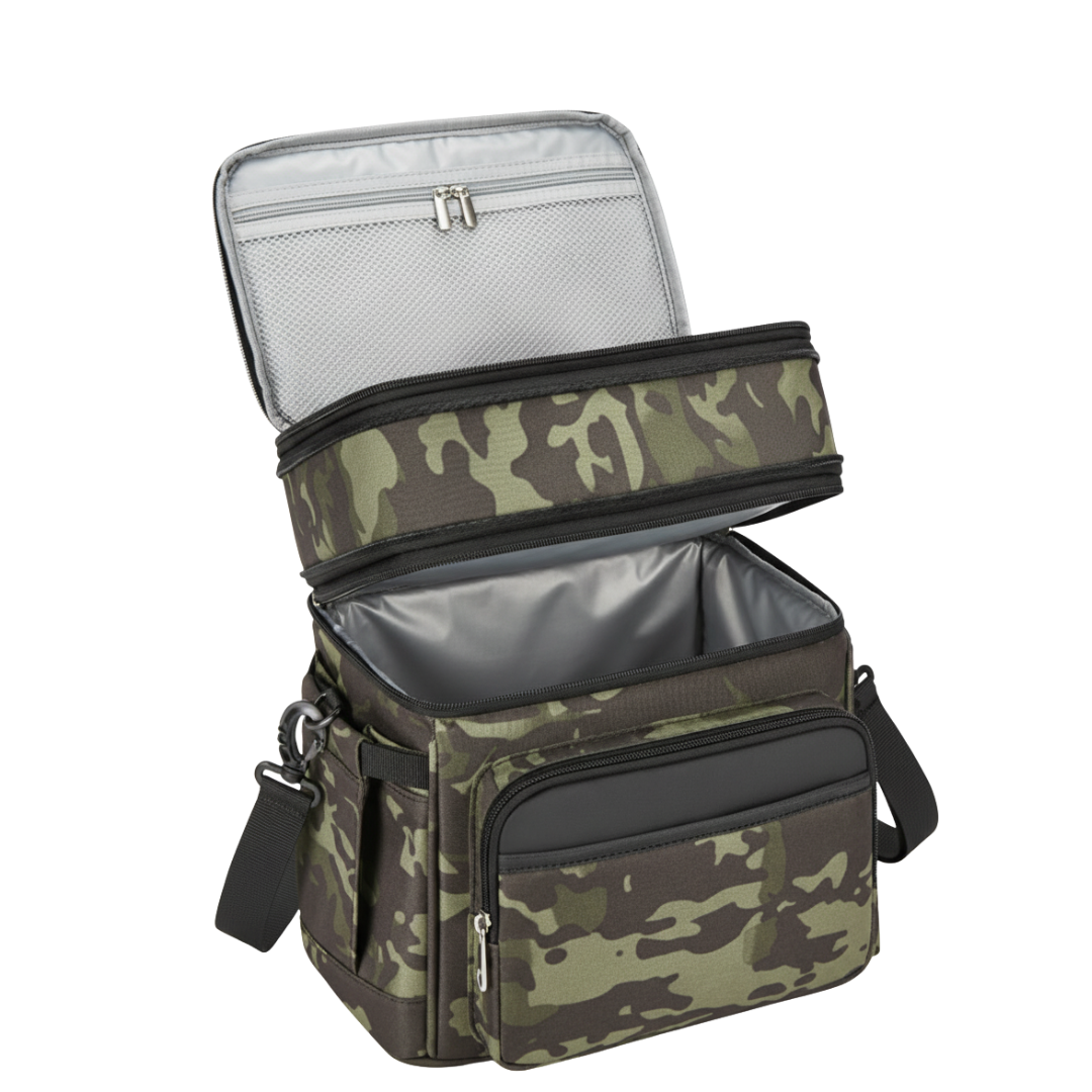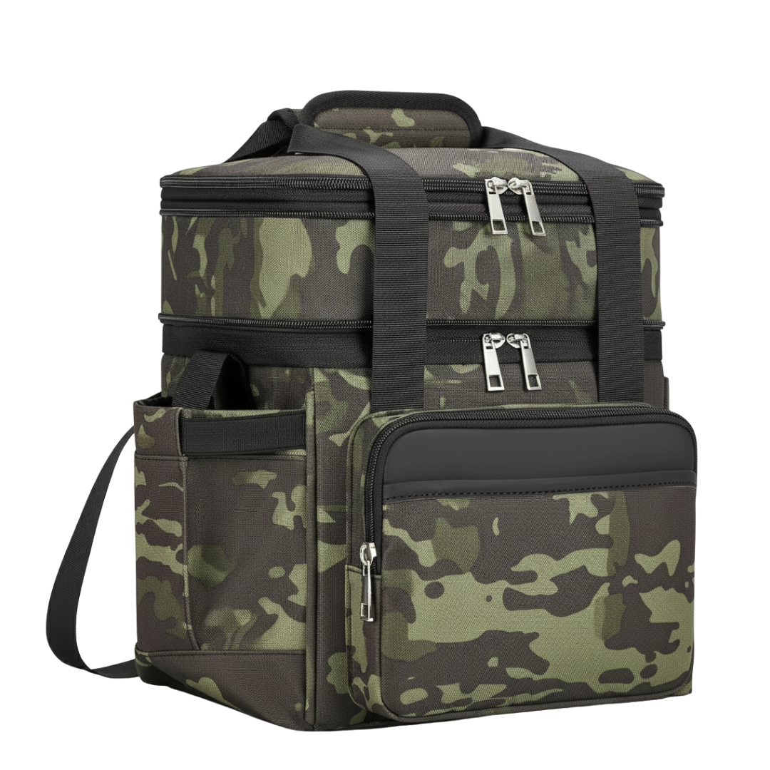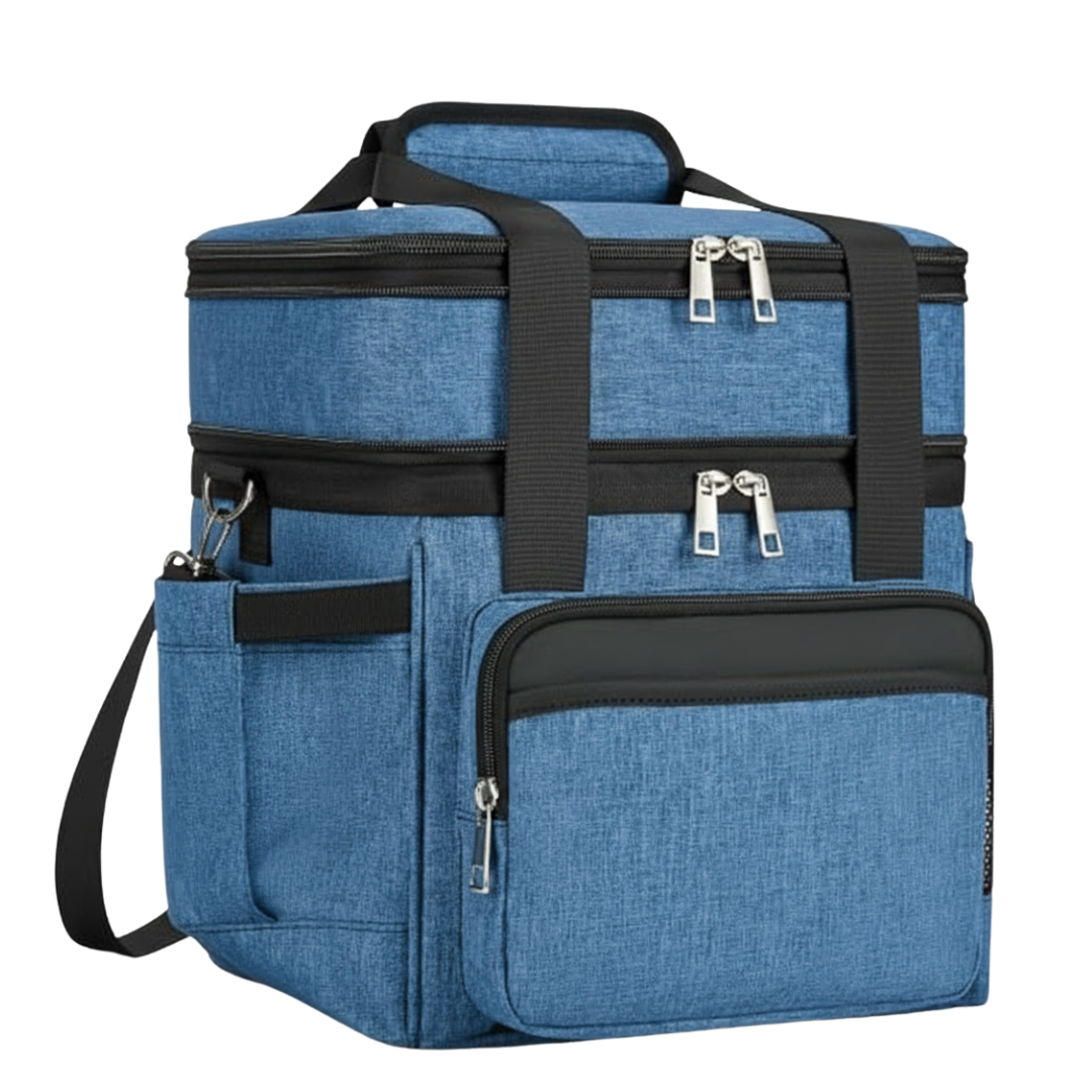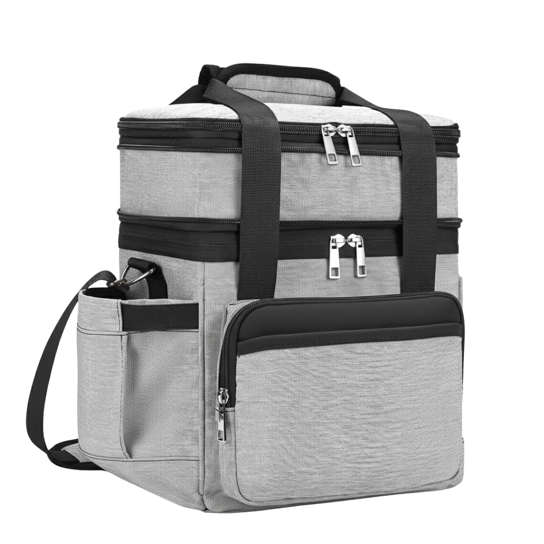 The dual-compartment design separates dry and wet foods, keeping textures intact during transport. The upper area fits snacks or fruit, while the lower compartment accommodates larger boxes or beverages. A six-millimeter insulated liner helps maintain temperature for 8 to 18 hours depending on the surroundings. Each compartment is sealed through heat-pressing to minimize leakage and preserve structure. Side and front pockets provide quick access to utensils, napkins, or small items during travel.